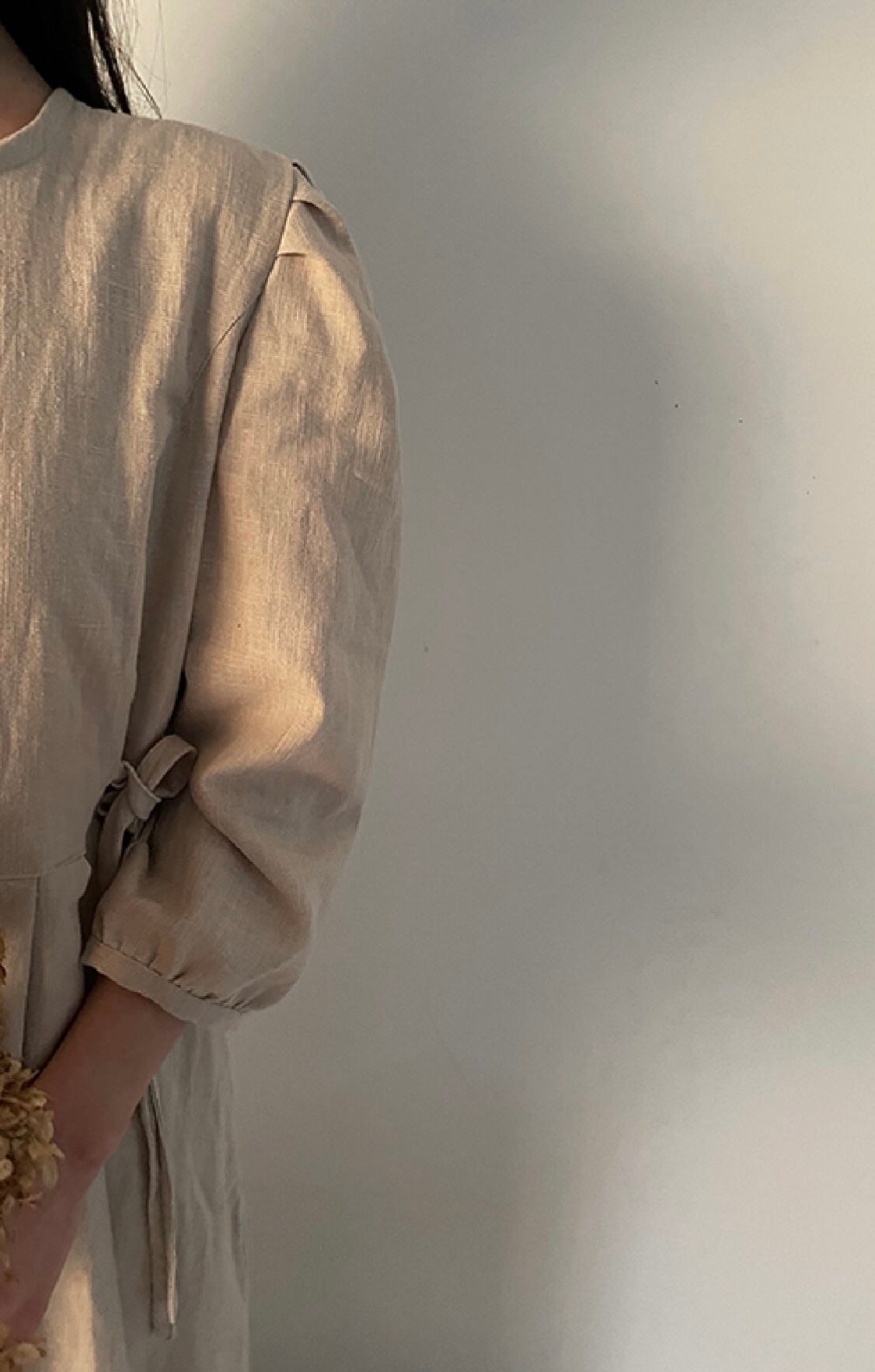 ホワイトカラーの既存デザインを改良し、新しい生地で仕立てたリニューアルバージョン。肩には繊細なシャーリングを施し、腰部分にはリボンを結べる紐がついており、細やかなディテールが魅力です。