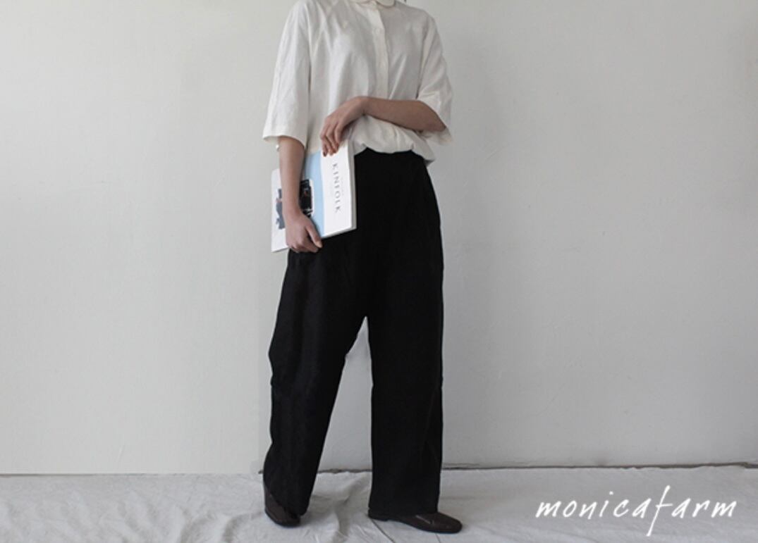 楽な着心地を追求したウエストのバンディング仕様と、ワイドフィットがスリム見えを叶えるデザイン。どんなシーンにも合わせやすい、Monica Farmの数少ないパンツラインのひとつです。