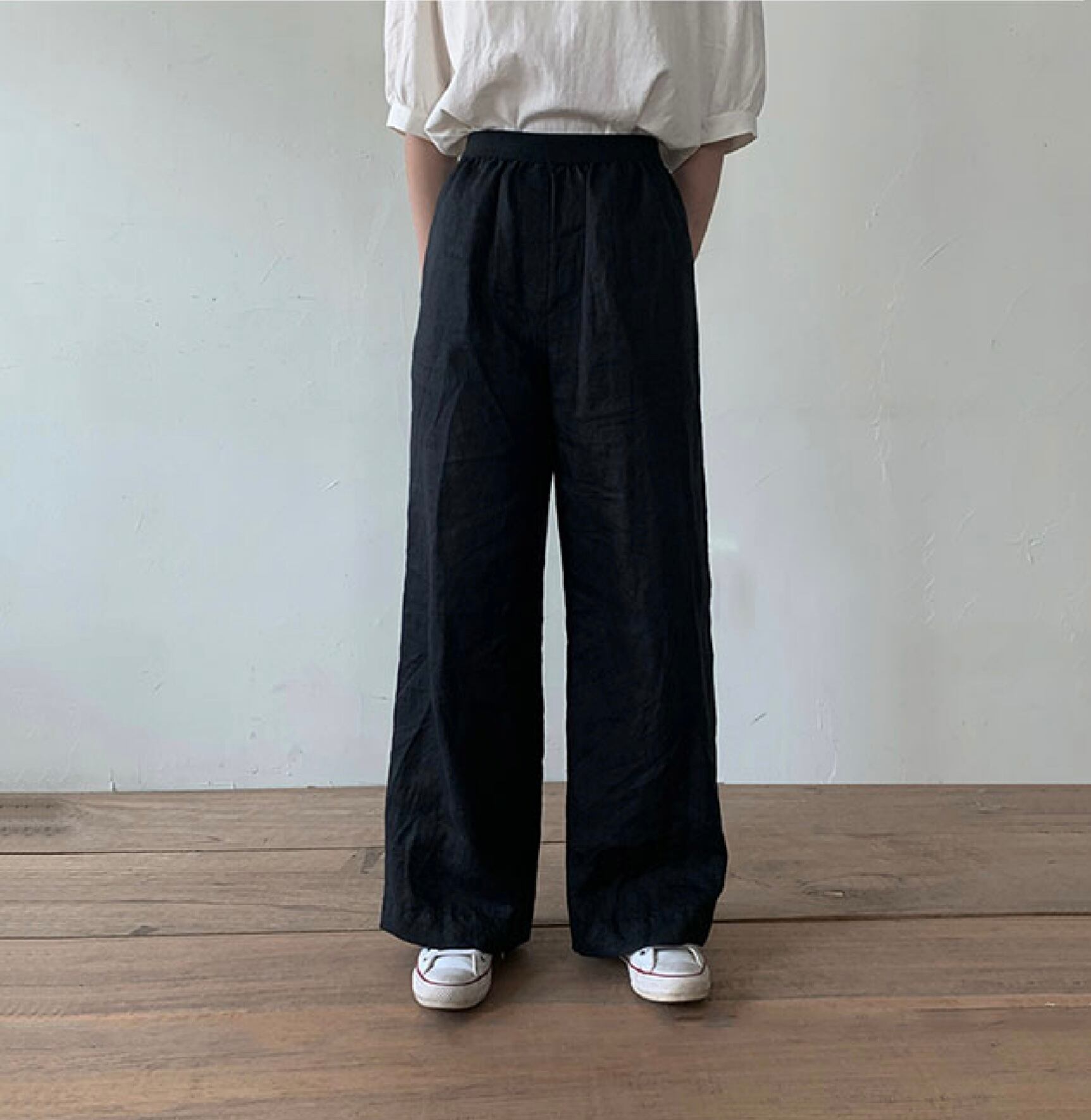 腰回りはゴムひも仕様でリラックスしたフィット感を実現しつつ、長めの丈感がスタイルを美しく引き立てます。デイリーユースからお出かけまで、どんなシーンでも活躍する万能な一本です。